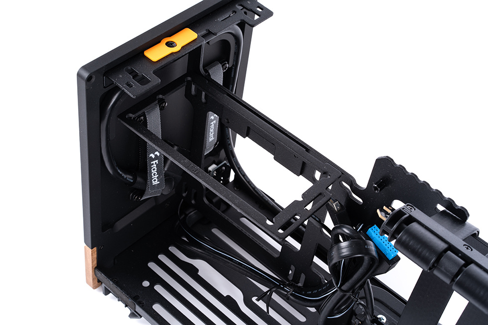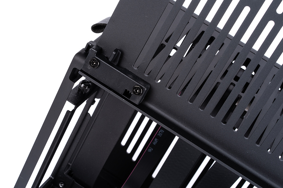 主板安裝位旁邊爲電源安裝位,主框架上帶安裝支架,支持SFX或SFX-L電源。頂部的黃色螺絲墊片依舊標刻有1-7的數字,輔助中框支持左右移動調節。