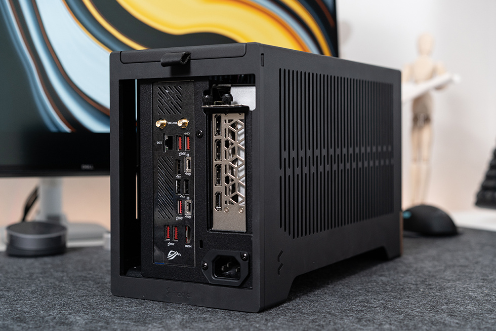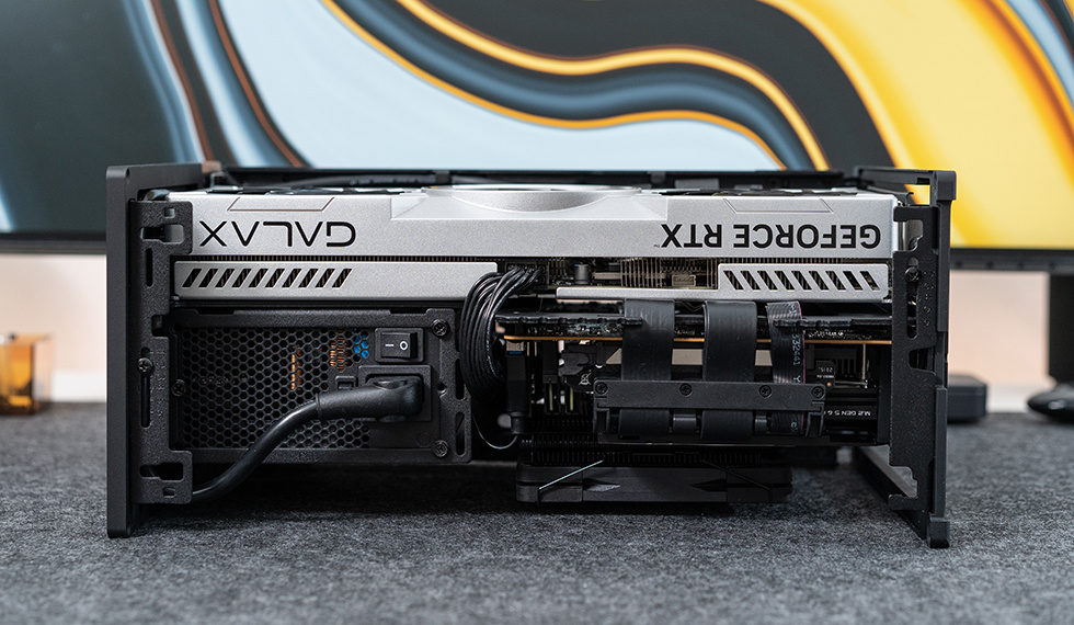 看一下內部結構,標準A4架構,右側爲電源和主板倉位,左側爲顯卡倉位,通過一條PCI4.0延長線相連接。