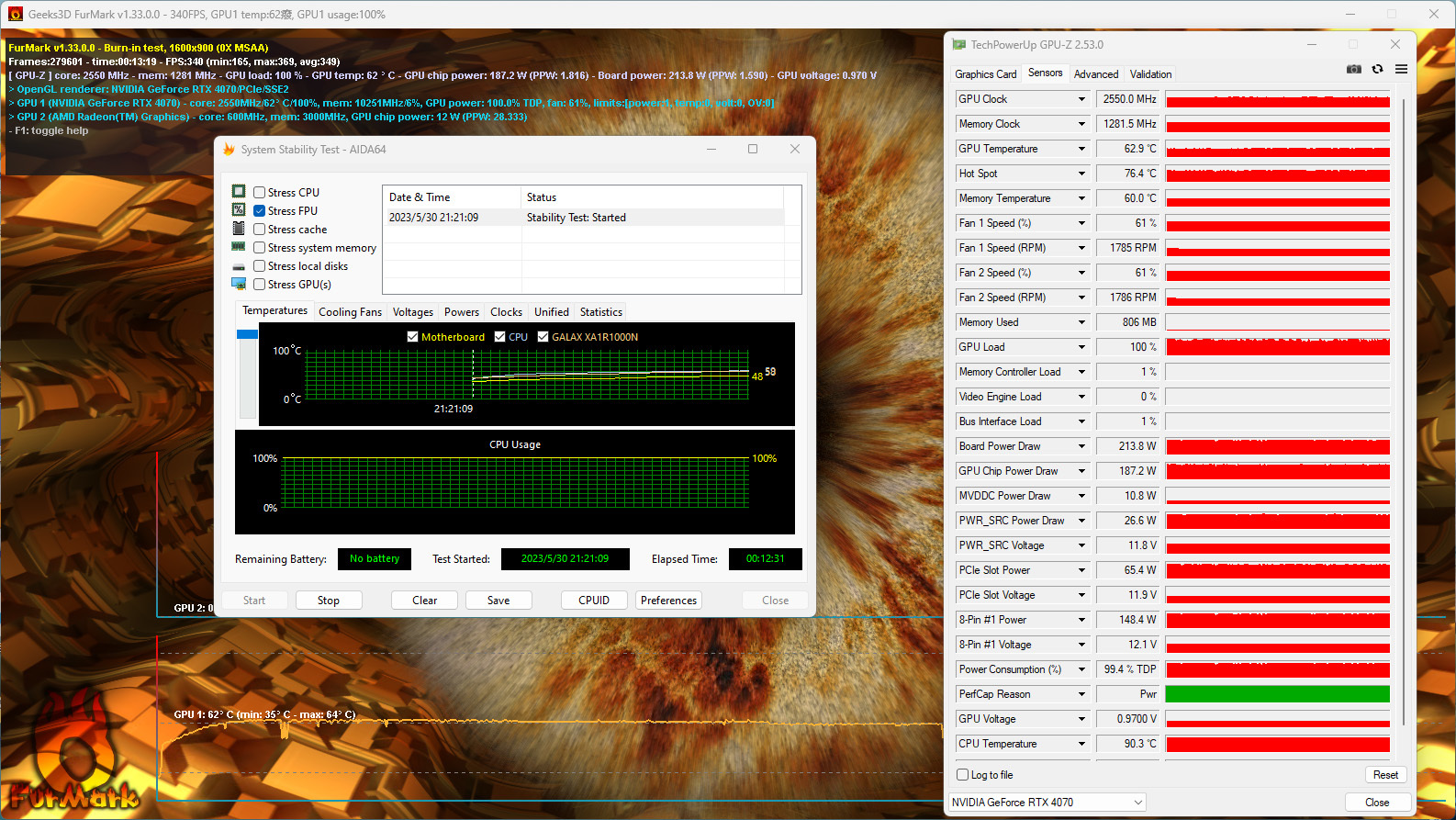 首先看一下雙滿載的溫度表現,CPU設定了90℃的溫度牆,顯卡的話最高溫度62.9℃,得益於Terra的四面通風設計,整機的溫度表現還是很不錯的。