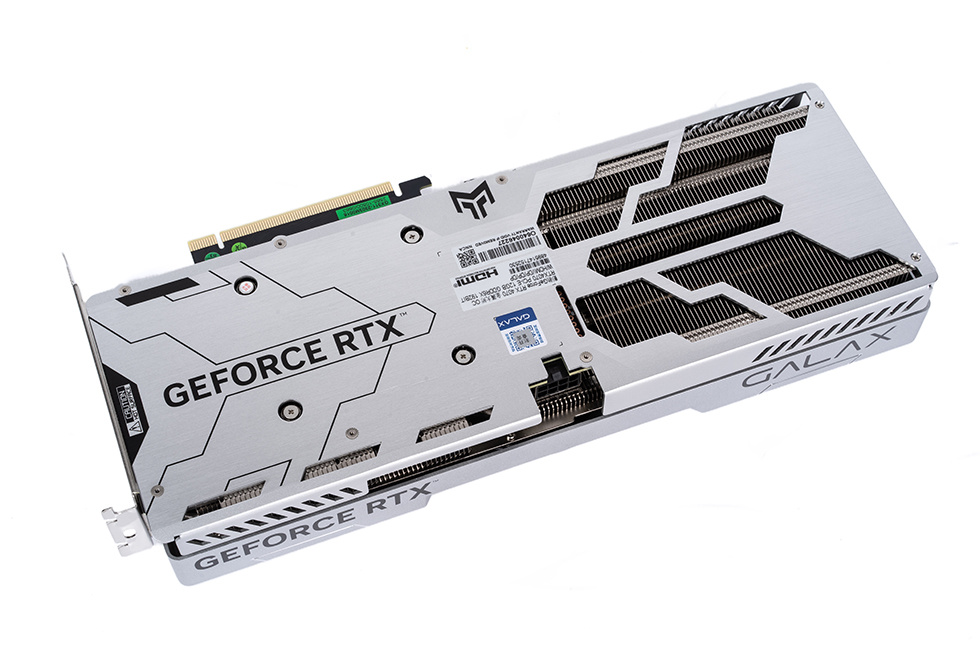 影馳RTX 4070金屬大師顯卡的爲全金屬的設計,背板中間的GEFORCE RTX logo和金屬大師裝飾紋,介於PCB版型短,右邊則爲大面積鏤空散熱設計,散熱鰭片排布工整,有效增加散熱效能。