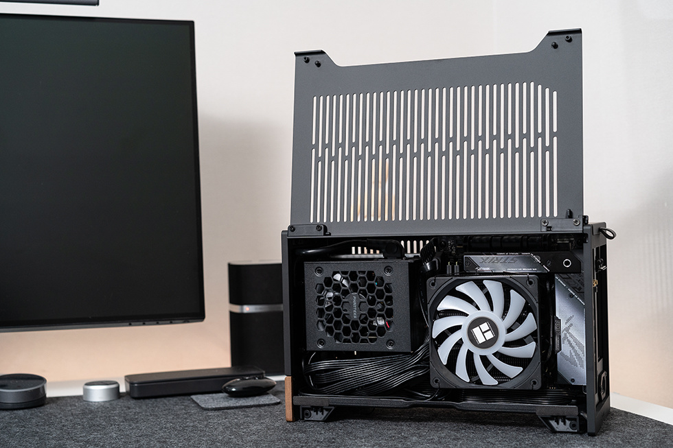 頂部視角,內藏可平滑移動的中央隔板能提供30mm調整空間,在左右分倉比例上,我選擇了2檔位,剛好兼容2槽位的下和67mm高度的散熱器。爲什麼喜歡ITX,就是喜歡這種塞滿的感覺。