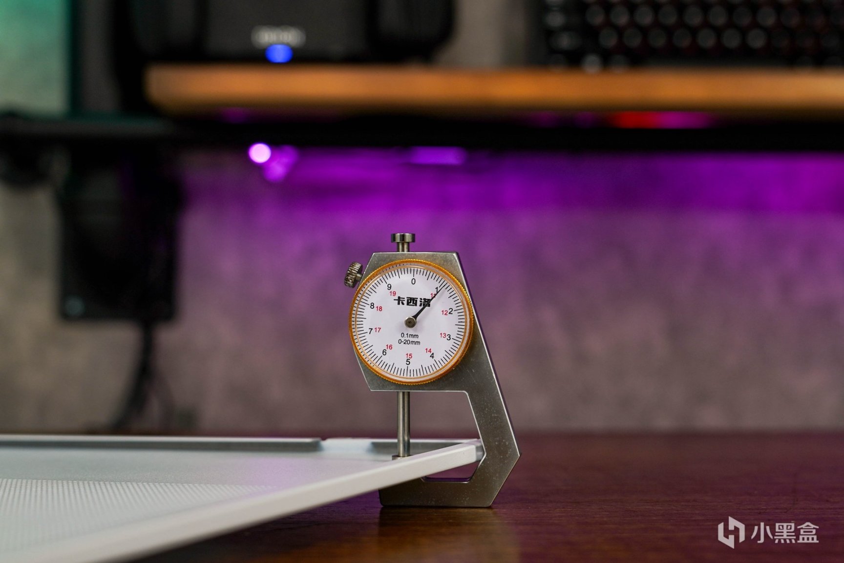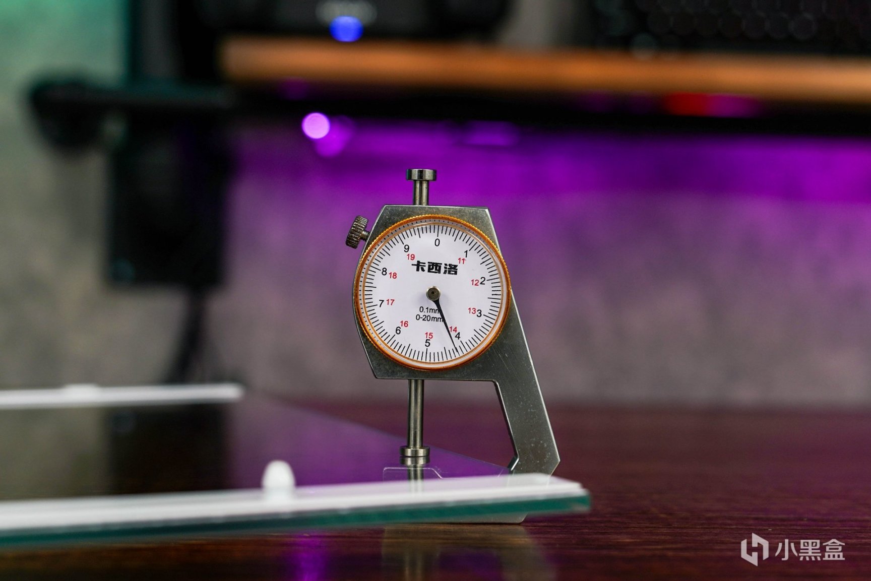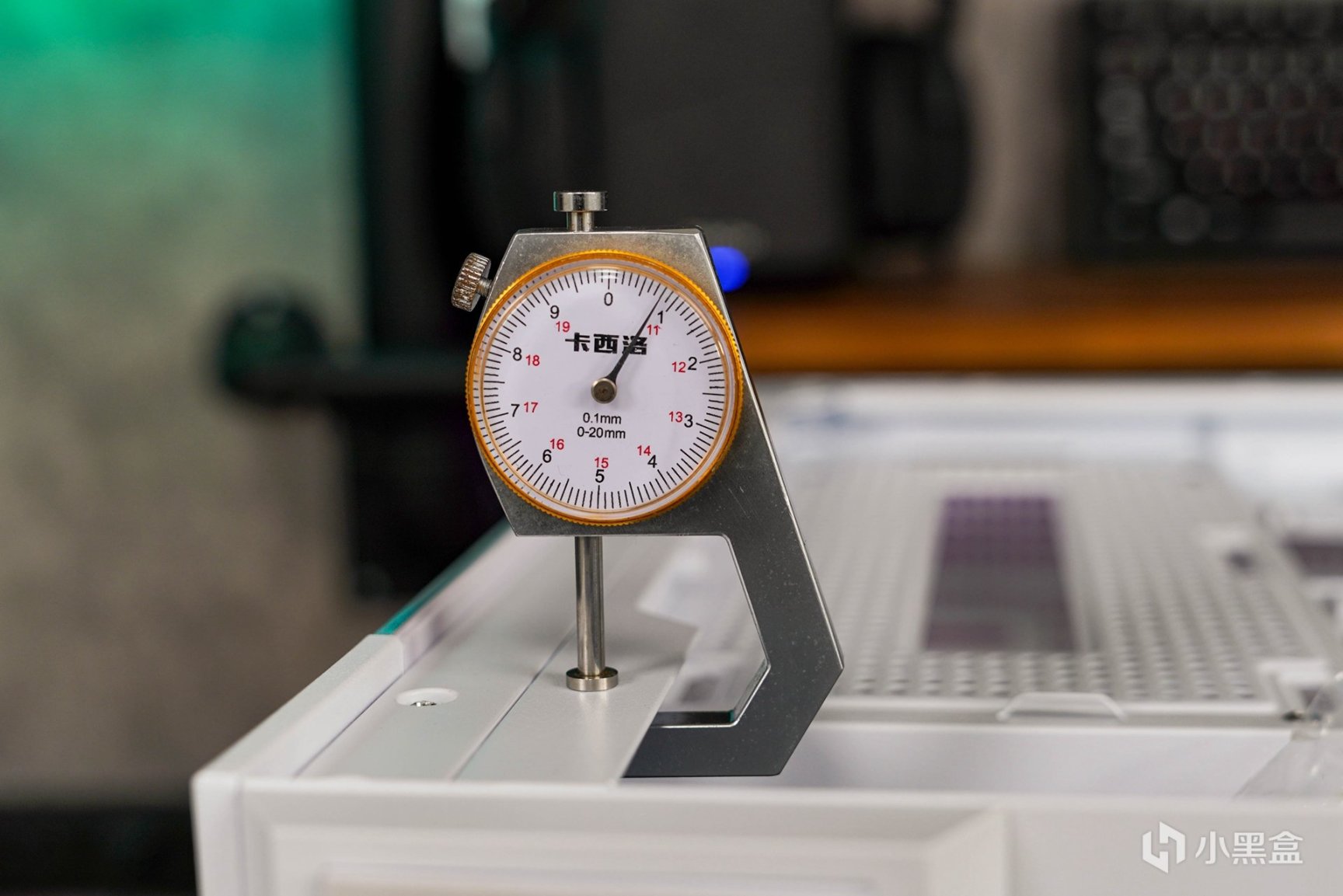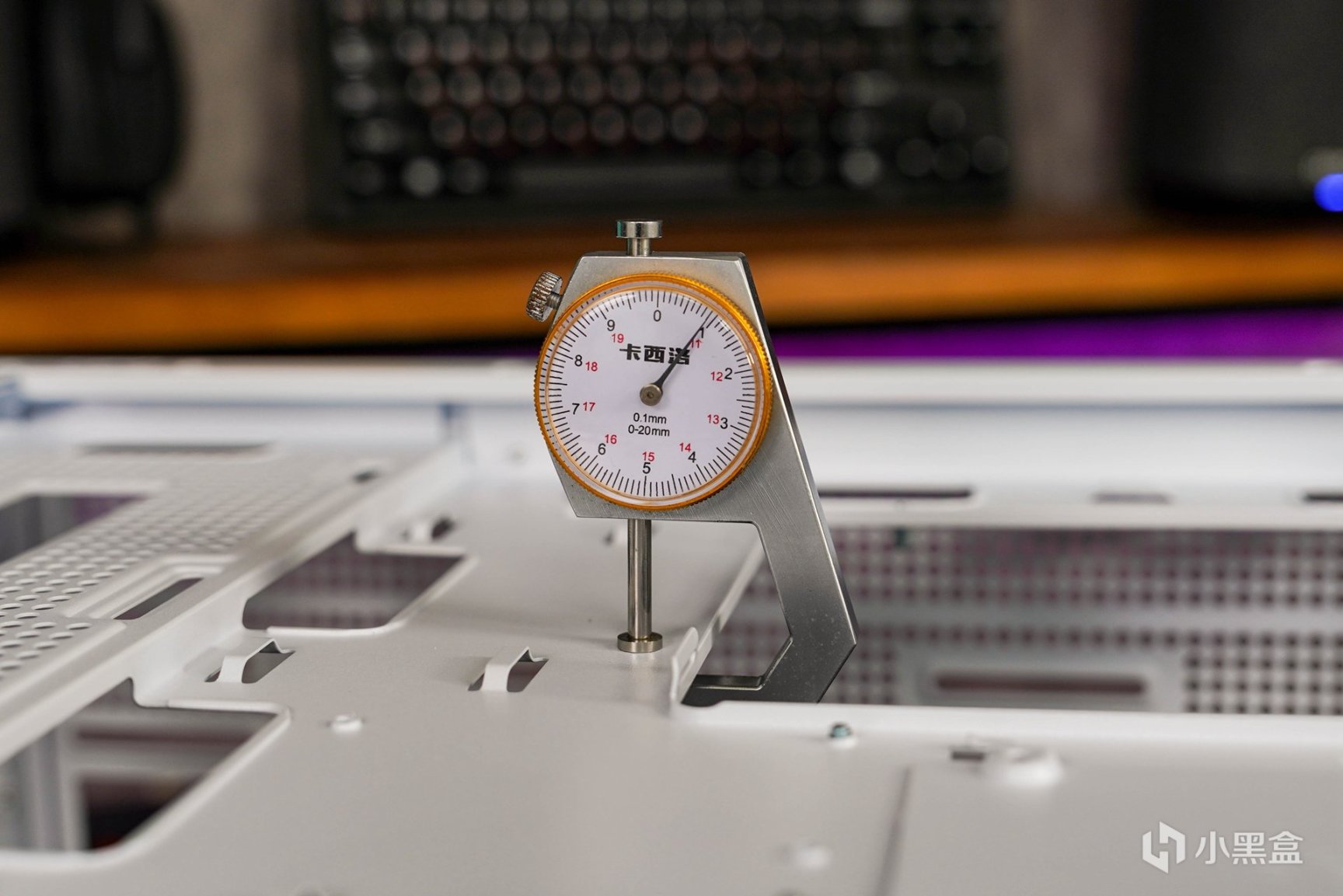 機箱外觀上是沒有什麼太多的挑剔的點,那麼在用料上是否會縮水?利用上手上的測厚儀先來看下機箱的主體框架,測厚儀測出的結果:1MM厚度,邊緣部分的五金厚度0.8MM。