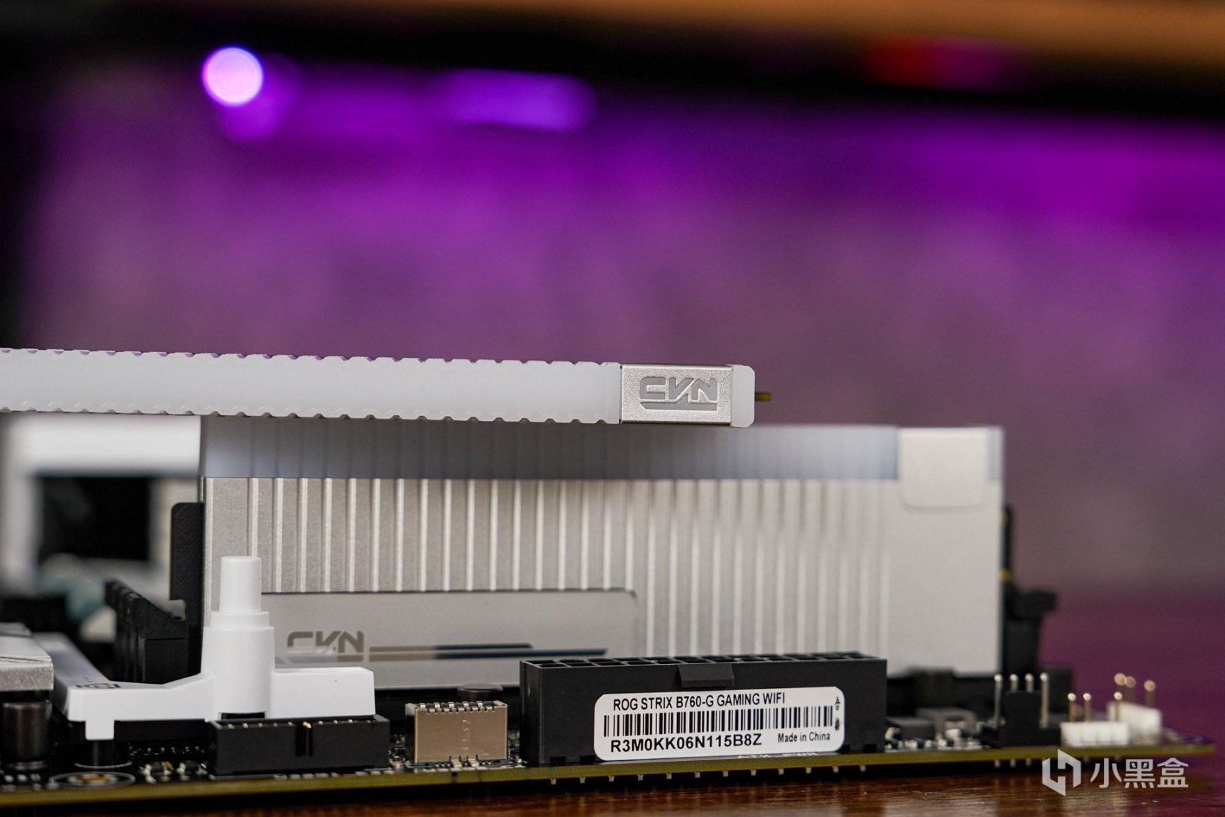 此外內存頂部燈效是重新調整了發光面積,銀河RGB燈效擁有更爲優秀的燈效表現,且採用了鎖邊設計,前置使用了CVNLOGO的壓邊來穩固燈條。