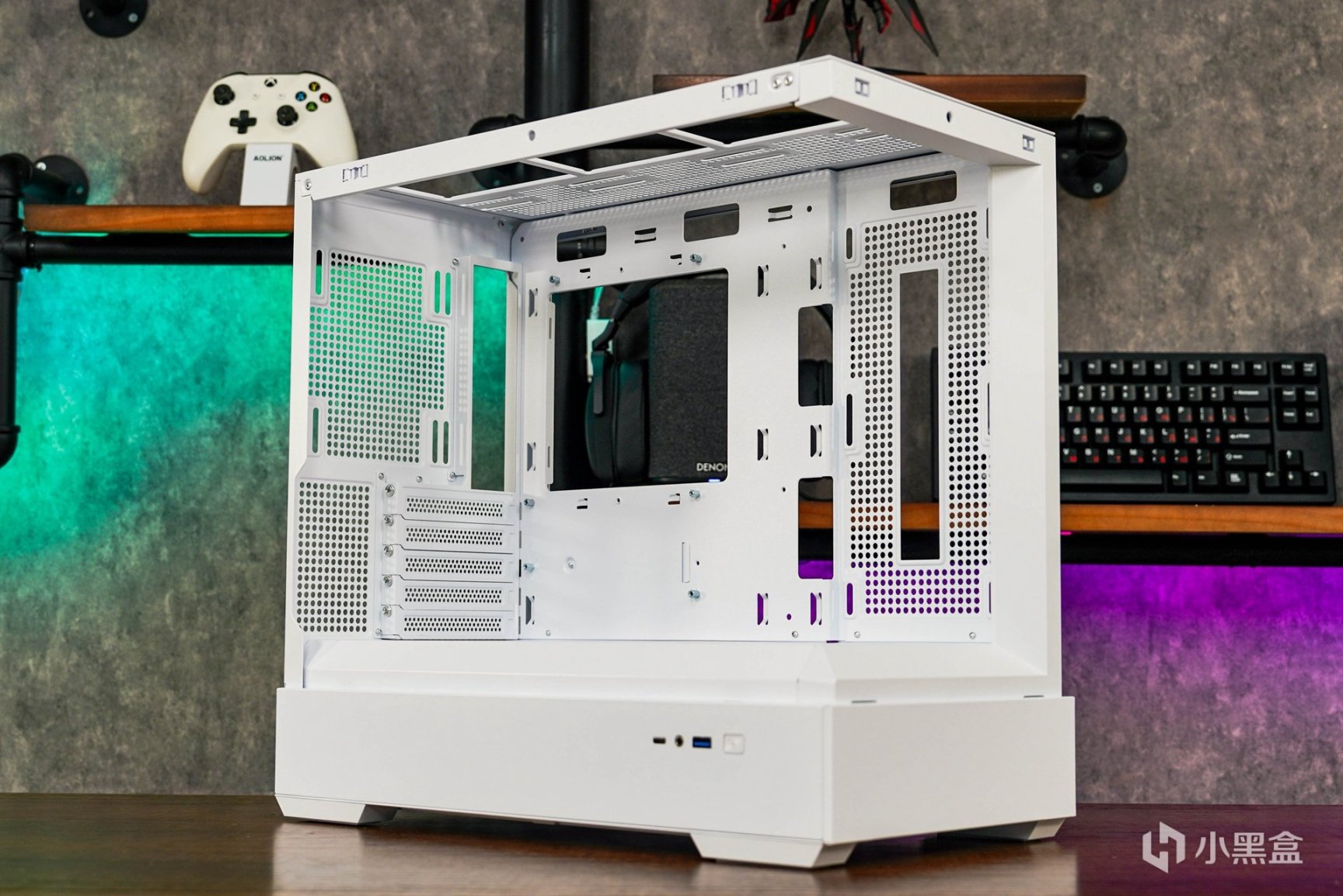 左右和前置上置四個面板均採用彈扣快拆設計,這種彈扣快拆技術也是非常成熟了,比某些品牌還在繼續沿用那個4個打孔螺絲來固定,防爆和美觀性上都有優勢,拆卸所有面板後整個機箱的左側安裝位與兼容佈局均可以呈現出來。