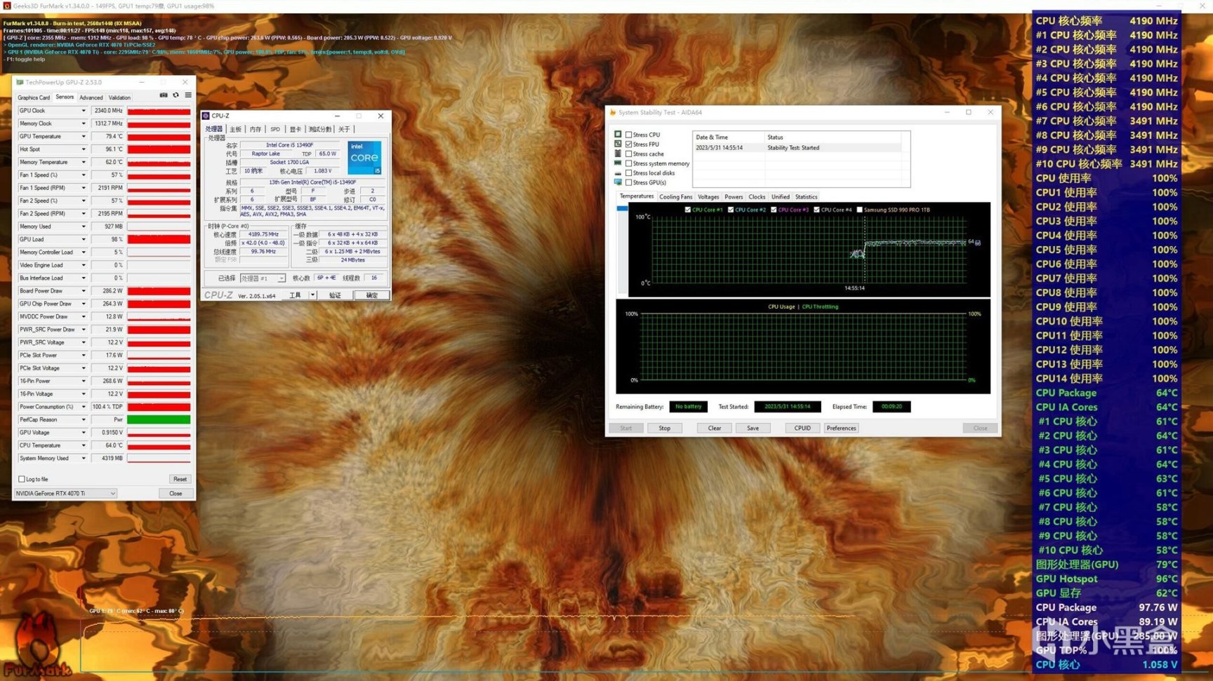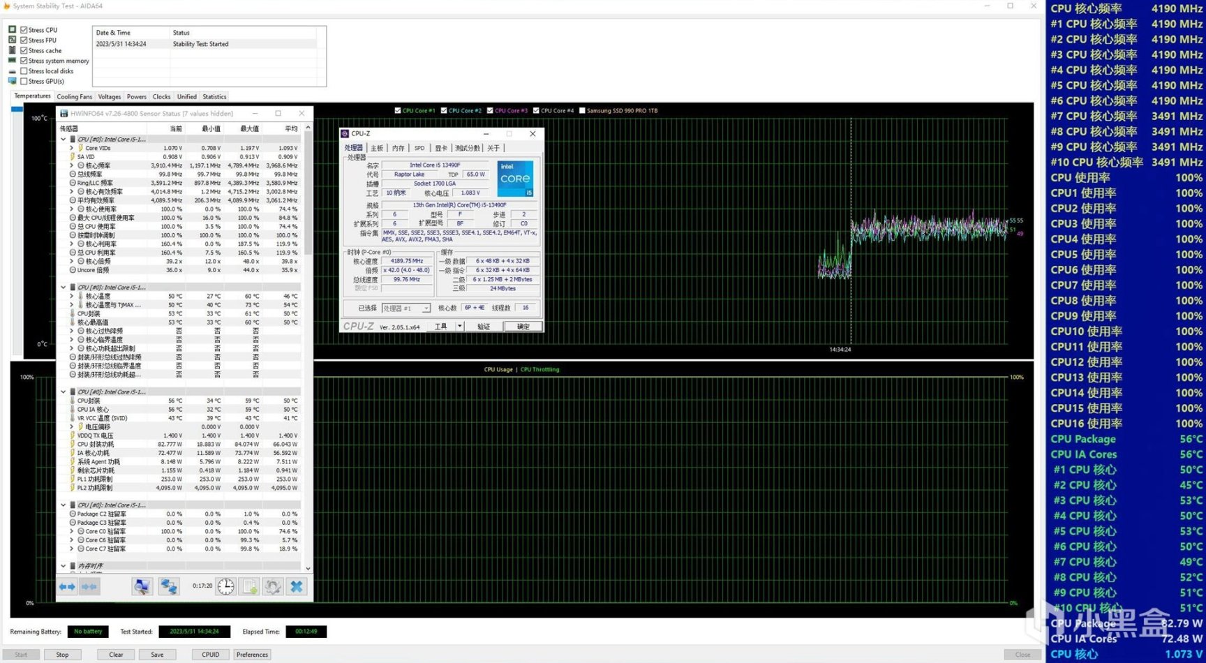 在滿載烤機(模擬滿載工作環境),全核心溫度和遊戲進行時最高溫度差別不大,滿載CPU核心溫度爲56℃。在CPU和顯卡雙烤溫度:64℃/79℃。大家可以對比下游戲進行時和滿載工作室兩個不同運行環境下的溫度對比。