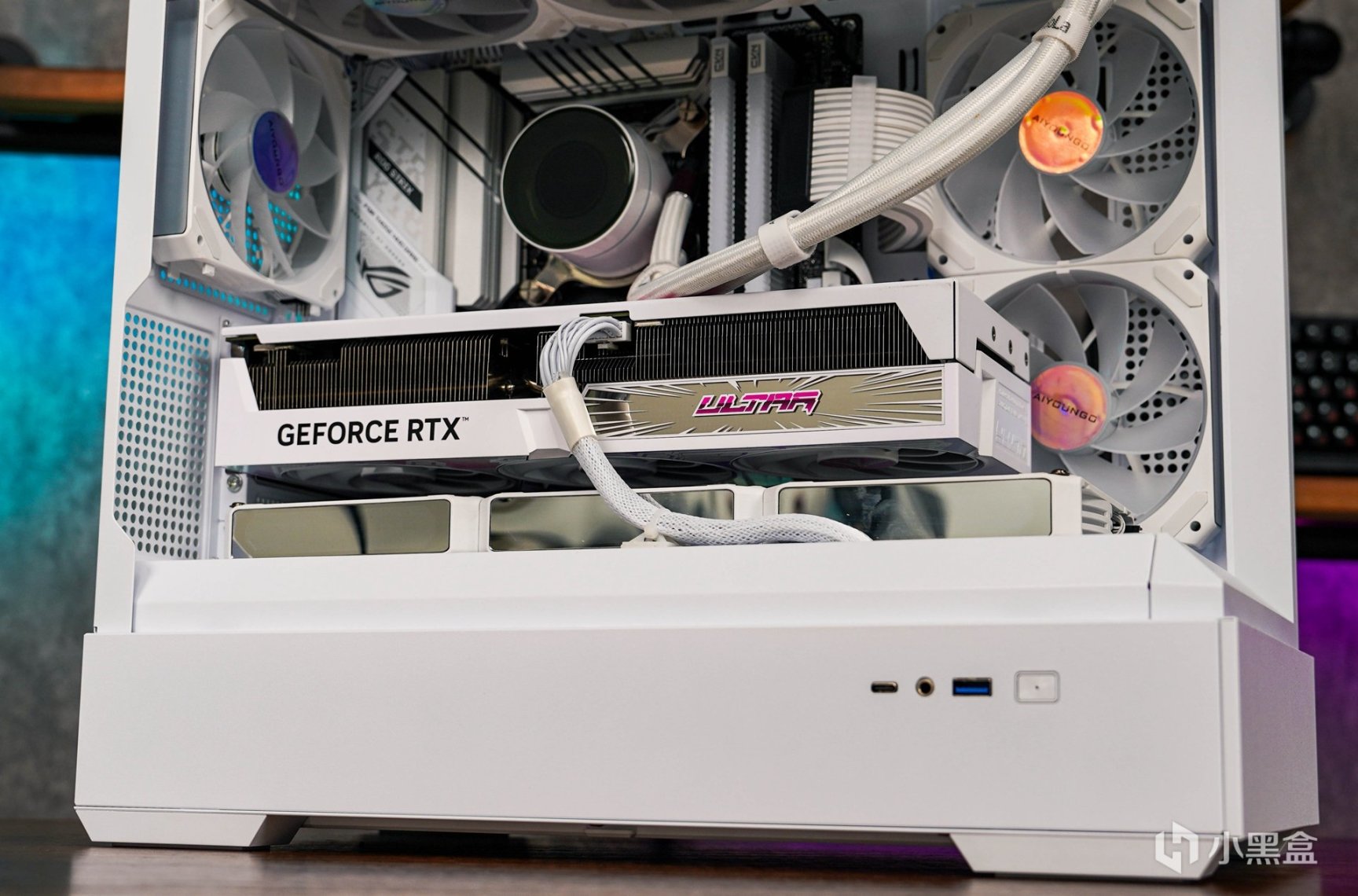 在一些比較緊湊的箱體內的兼容問題,在這款機箱裏面基本是看不到,可以從箱內硬件安裝展示可以看到箱體內的其他協調安裝空間也是充足的,並不會顯得太過擁擠,該放的下的地方都兼顧到。機箱內部是支持長顯卡安裝的,最大顯卡安裝長度390MM,所以類似4080/4090/4070Ti這些三風扇長顯卡完全可以輕鬆兼容。要說在兼容上還有什麼不足的話,那就是不支持顯卡豎裝這點,估計後續這款機箱還會出ATX版本的。
