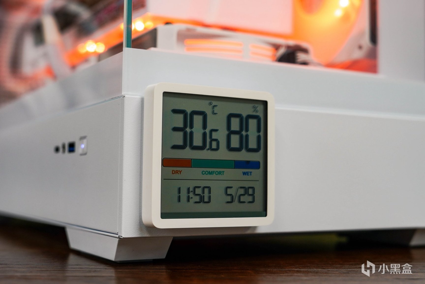 整個主機在散熱方面表現會如何?從溫度計上可以看到,測試時的室溫爲:30℃,溼度80%。模擬遊戲環境下可以從3D MARK溫度監控下看到顯卡平均維持在73℃左右,最高溫度可以達到76℃。CPU溫度則比較低溫,最高也只有53℃,而平均溫度則基本維持在44~46℃。