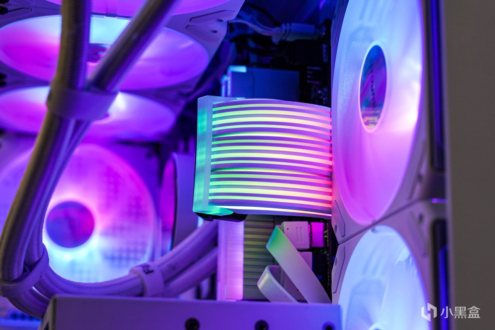 整機展示部分,幻彩模式也是非常養眼的,放置在桌面上的主機也是一股不能忽略的個性炫酷擺件,這種風格的展示更適合喜歡燈效氛圍的你。