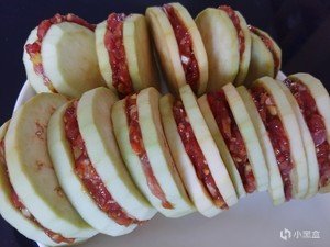 把肉餡添加到茄子片中,一次不要夾太多,否則下鍋時會散開