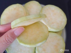 將茄子洗乾淨去皮,用刀切成一樣大小的圓片,注意不要完全切開