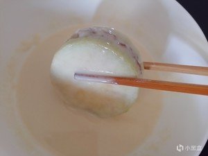 先把茄子撒上乾麪粉封口,防止肉散開,然後放入調好的麪糊中,讓麪糊均勻的掛在茄子上