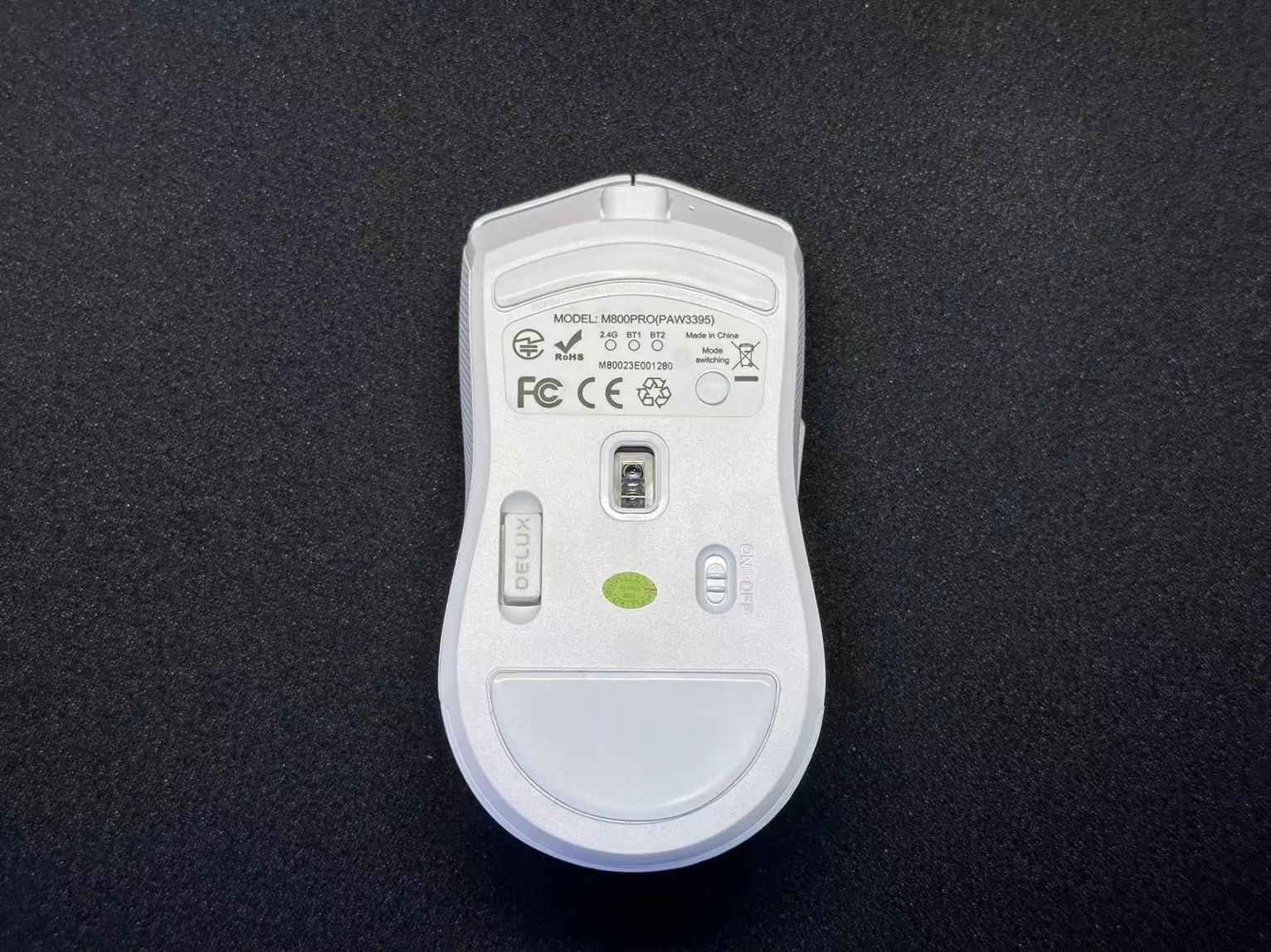 M800pro底部是有给做2.4G收纳仓的,这点好评。鼠标的开关和配对也分别做在了鼠标底部。