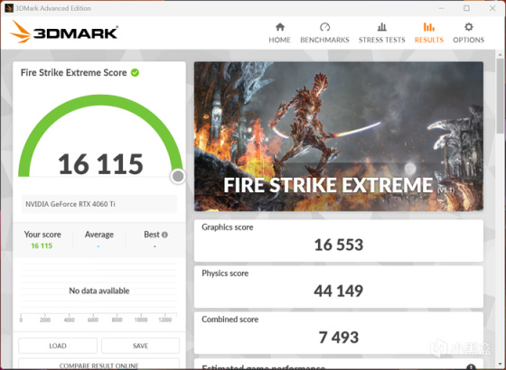 Fire Strike Extreme 测试显卡得分 16553 分。