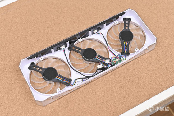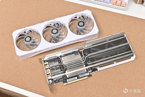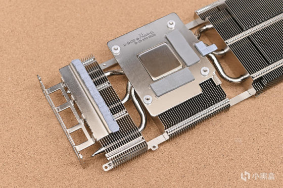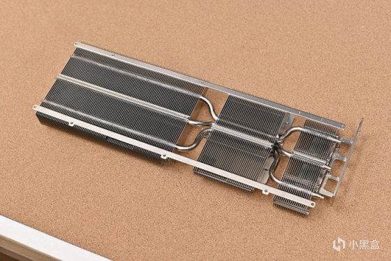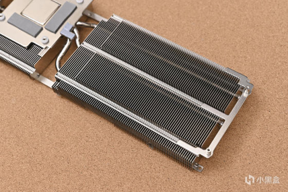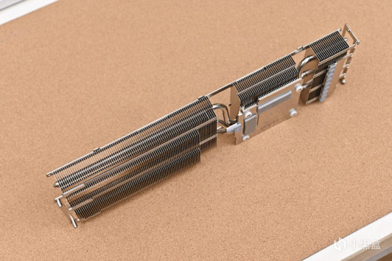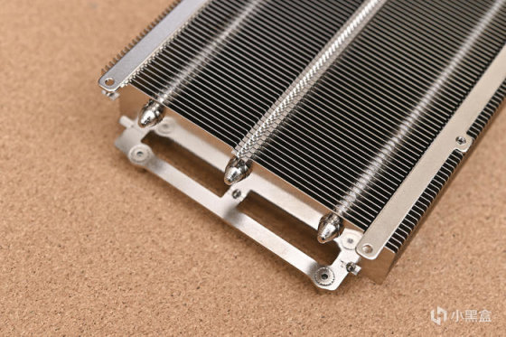 鳍片密度很高,中央热管贯穿,远核心段的散热片内热管则交错平铺排列,采用回流焊工艺。鳍片排布中轴和两侧位置均做了切角处理优化扰流。
