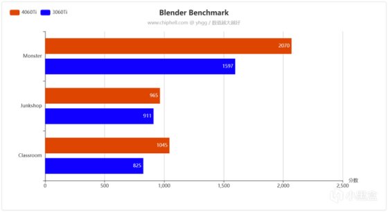 其中,4060Ti monster 得分 2070 分,3060Ti 得分 1597 分,领先 3060Ti 473 分;4060Ti Junkshop 得分 965 分,3060Ti 得分 911 分,领先 3060Ti 54 分;4060Ti Classroom 得分 1045 分,3060Ti 得分 825 分,领先 3060Ti 220 分。