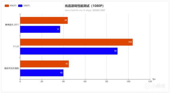 接下来是光追游戏测试。在 1080P 开启光追的情况下,RTX 4060Ti 和 RTX 3060Ti 相比几款游戏综合测试过来,RTX 4060Ti 整体都略领先 3060Ti,整体性能要领先 14% 左右,。赛博朋克 2077 游戏中,RTX 4060Ti 平均帧率 44 FPS,RTX 3060Ti 37 FPS,4060Ti 略高于 3060Ti 7 帧;F1 22 游戏中,RTX 4060Ti 平均帧率 104 FPS,RTX 3060Ti 90 FPS,4060Ti 高于 3060Ti 14 帧。