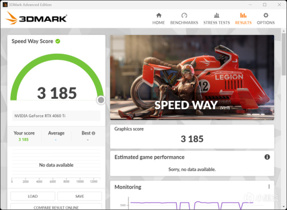 3D Mark 基准性能测试方面,影驰 GeForce RTX 4060Ti 8GB 星曜 OC Speed Way 测试得分 3185 分。