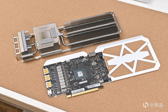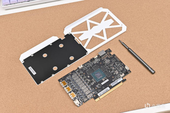 拧开 PCB 核心四颗固定螺丝,以及显卡背板尾部两颗固定螺丝,轻轻撬动 PCB 即可将散热模组和 PCB 分离。