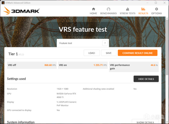 VRS feature test 测试。RTX VSR 是 AI 图像处理的突破,它超越了传统的边缘检测和特征锐化技术,极大地提升直播视频内容的质量。RTX VSR 需要使用 GeForce RTX 40 或 30 系列 GPU,并且几乎适用于 Google Chrome 和 Microsoft Edge 浏览器中的所有视频内容。测试第一章节,VRS 关闭为 868.6 FPS,VRS 开启为 1255.71 FPS,性能提升 44.6%。