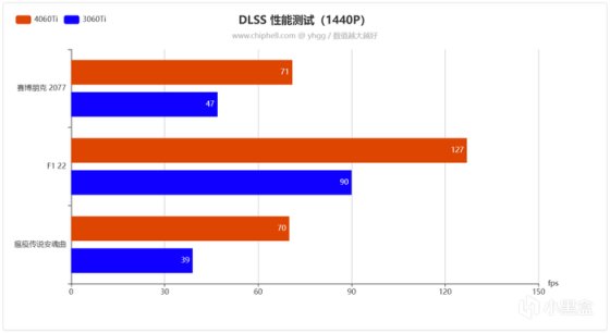 1440P 游戏测试中,赛博朋克 2077 游戏中,RTX 4060Ti 开启 DLSS 3 平均帧率 71 FPS;RTX 3060Ti 开启 DLSS 2 平均帧率 47 FPS。开启 DLSS 3 的 RTX 4060Ti 领先 RTX 3060Ti 达 24 帧。