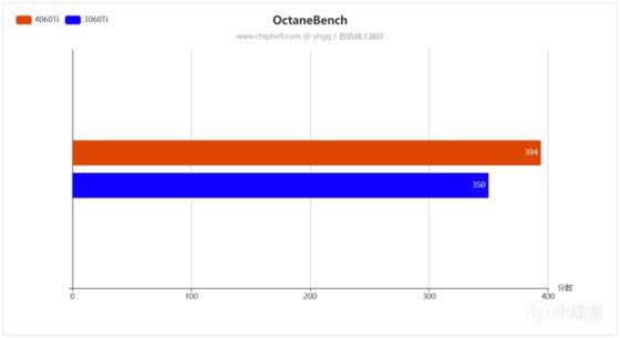 OctanceBench 渲染测试中,4060Ti 得分 394 分,3060Ti 得分 350 分,领先 3060Ti 44 分。