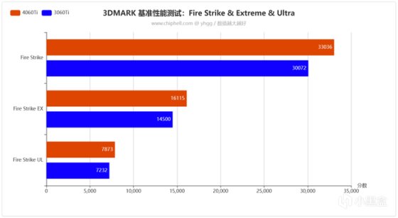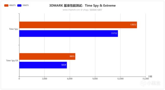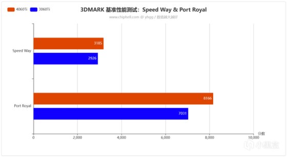 基准测试横向对比测试了上一代 3060ti。其中 Speed Way 使用光线追踪和实时全局照明来渲染逼真的照明和反射,支持 DirectX 12 Ultimate 功能来优化性能和视觉质量;Port Royal 是测试的显卡实时光线追踪的性能指数;Fire Strike Extreme测试显卡 2K 分辨率下 DX11 游戏性能;Fire Strike Ultra 测试显卡 4K 分辨率下 DX11 游戏性能;Time Spy 测试显卡 2K 分辨率下 DX12 游戏性能;Time Spy Extreme 测试显卡 4K 分辨率下游戏性能。以下做了几个柱形图作为直观参考,所有数值均采用显卡单向得分。可以看到 RTX 4060Ti 在各个分辨率下整体全面要好于 RTX 3060Ti 的性能表现。