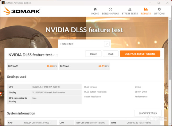 NVIDIA DLSS功能测试。DLSS 关闭 16.70 FPS,DLSS 开启 62.89 FPS。DLSS 3 由 GeForce RTX 40 系列 GPU 所搭载的全新第四代 Tensor Core 和光流加速器提供支持,相比 DLSS 2 增加了帧生成技术,能够预测中的运动,在保持图像质量的同时实现更高的帧率。