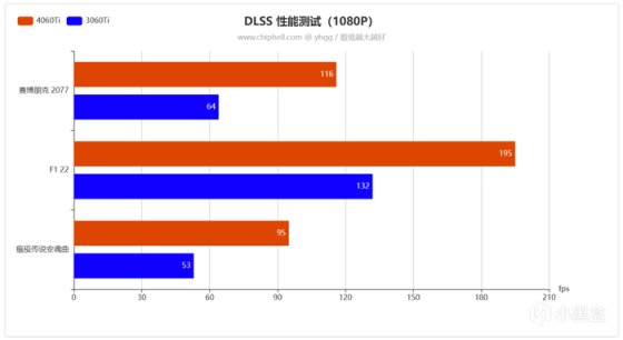 1080P 游戏测试中,赛博朋克 2077 游戏中,RTX 4060Ti 开启 DLSS 3 平均帧率 116 FPS;RTX 3060Ti 开启 DLSS 2 平均帧率 64 FPS。开启 DLSS 3 的 RTX 4060Ti 领先 RTX 3060Ti 多达 52 帧。