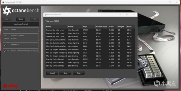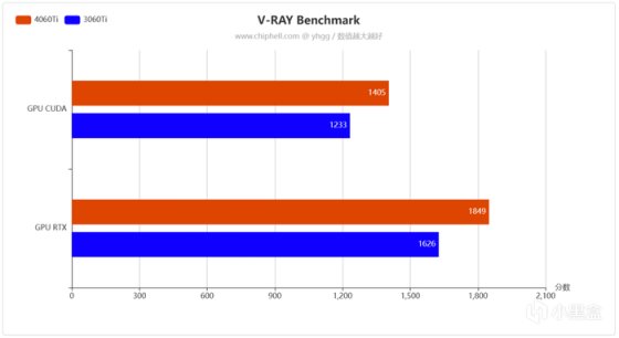 4060Ti V-Ray GPU CUDA 得分 1405 分,而 3060Ti 得分 1233 分,领先 3060Ti 172 分;4060Ti V-Ray GPU RTX 得分 1849 分,而 3060Ti 得分 1626 分,领先 3060Ti 223 分。