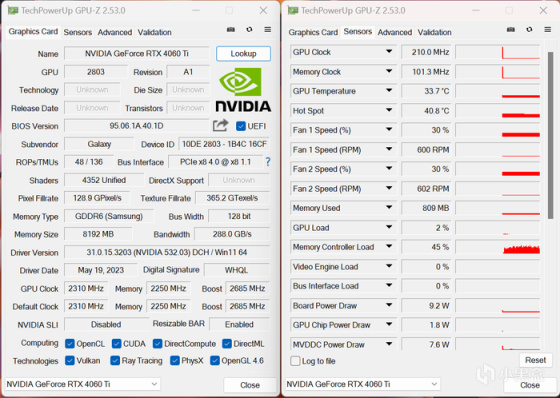 影驰 GeForce RTX 4060Ti 8GB 星曜 OC GPU-Z信息。拥有 4352 个 CUDA,核心基础频率 2310MHz,加速频率 2685MHz,显存为 8GB GDDR6,32MB L2 大缓存,显存位宽 128-bit,显存频率 18Gbps。