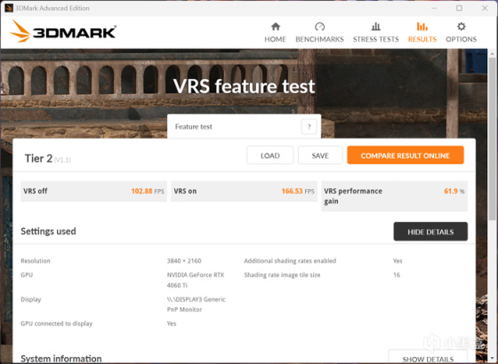 测试第一章节,VRS 关闭为 102.88 FPS,VRS 开启为 166.53 FPS,性能提升 61.9%。
