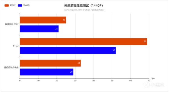 在 1440P 开启光追的情况下,RTX 4060Ti 和 RTX 3060Ti 相比整体性能逐渐缩小,几款游戏综合测试过来,RTX 4060Ti 整体都略领先 3060Ti领先 11% 左右,。赛博朋克 2077 游戏中,RTX 4060Ti 平均帧率 25 FPS,RTX 3060Ti 21 FPS,4060Ti 略高于 3060Ti 4 帧;F1 22 游戏中,RTX 4060Ti 平均帧率 69 FPS,RTX 3060Ti 52 FPS,4060Ti 高于 3060Ti 17 帧。
