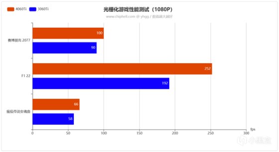 首先是光栅游戏测试。在 1080P 不开启光追的情况下,RTX 4060Ti 和 RTX 3060Ti 相比整体性能要领先 15% 左右,几款游戏综合测试过来,RTX 4060Ti 整体都略领先 3060Ti,个别游戏领先幅度较大。赛博朋克 2077 游戏中,RTX 4060Ti 平均帧率 100 FPS,RTX 3060Ti 90 FPS,4060Ti 略高于 3060Ti 10 帧;F1 22 游戏中,RTX 4060Ti 平均帧率 252 FPS,RTX 3060Ti 192 FPS,4060Ti 远高于 3060Ti 60 帧。