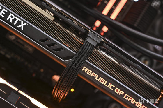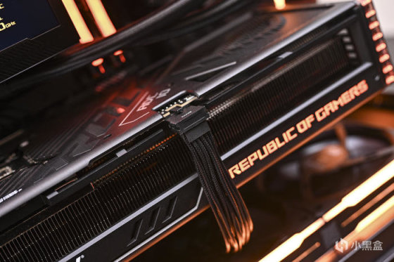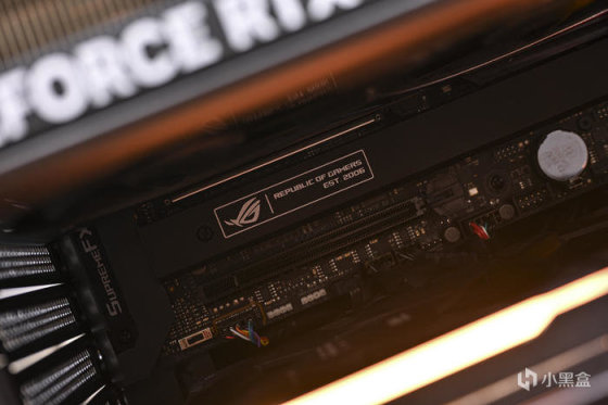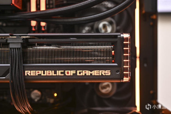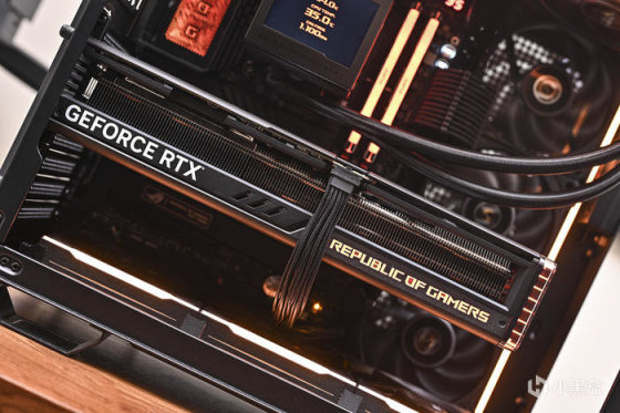 顯卡側面右側下方是 REPUBLIC OF GAMERS Logo 字樣,右側透明亞克力爲環形燈帶,同時具備 ARGB 燈效。