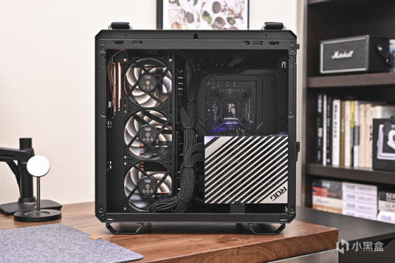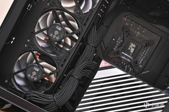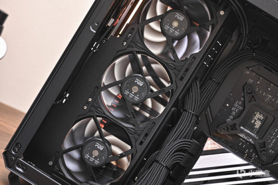 頂部 ROG RYUO III 360ARGB 龍王三代 White 冷排搭配了 3 把聯力 LIANLI UNI Fan P28 積木風扇。
