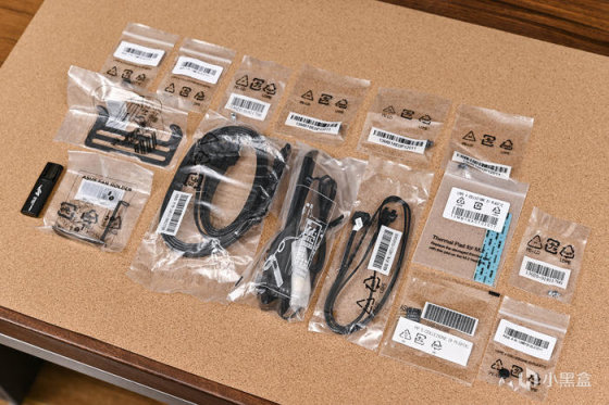 附件非常豐富:Wi-Fi 天線、ROG HYPER M.2 CARD、M.2 導熱貼、4 根 SATA 線、1 個 Q CONNECTOR(機殼排線集線器)、USB 隨身碟(內附驅動與說明文件)、多顆 M.2 螺絲和螺柱和軟墊、RGB/ARGB 延長線、ROG VIP 卡,還有一個 VRM 風扇支架和一個內存風扇支架。