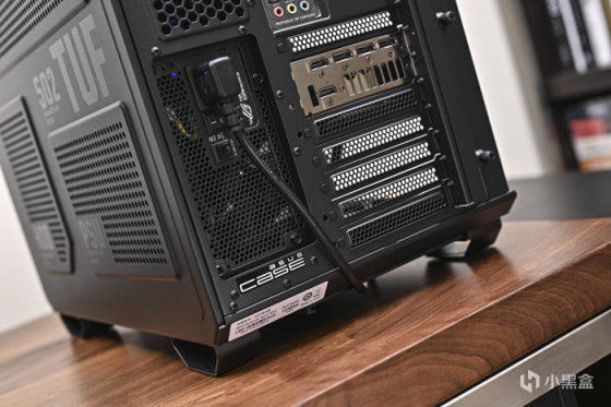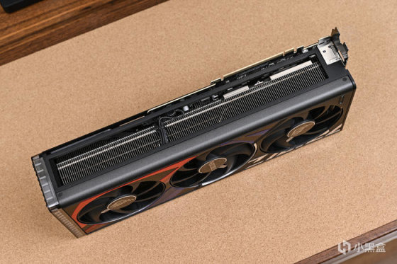 顯卡尾部斜紋格柵鏤空處理,尾部鏤空式設計,貫穿通風,減少尾部重量防止下垂,同時兼顧散熱風道。上面還雕刻有 ROG Logo,每一個組成條紋均爲高光倒角處理。