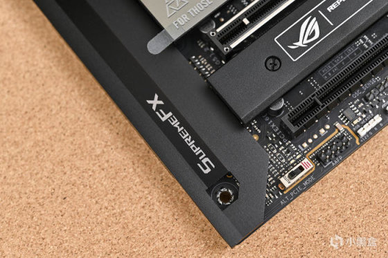 主板下方通體覆蓋大面積厚實的散熱裝甲,PCH 散熱器的外觀銀黑條紋組成的ROG信仰之眼,無 ARGB 燈效,個人更喜歡這樣有金屬質感的無光設計。兩個 PCIe5.0 x 16 擴展插槽的表面均有金屬保護罩,提高接口強度的同時還可以避免信號干擾,下方還有一個 PCIe 4.0x16 插槽。第一條 PCIE X 16 支持最高 PCI-E 5.0 X16,第二條 PCIE X 16 支持最高 PCI-E 5.0 X 8 (以上 2 根共享 CPU PCI-E 5.0 X16,提供 X16/X0 或 X8/X8 的組合),最下方PCIE x16 實際爲 PCI-E 4.0 X8 的通道,方便支持 ROG HYPER M.2 CARD 上的雙 PCI-E 4.0 X4 M.2 SSD。