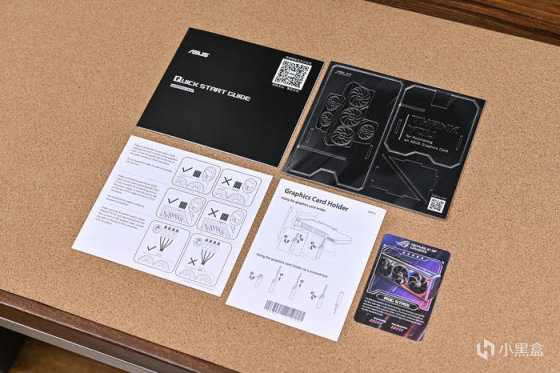附件方面,包括說明書、可組裝的華碩感謝卡、支架及供電線材使用指南,以及一張 ROG 產品收藏卡。