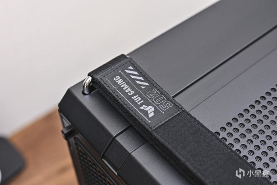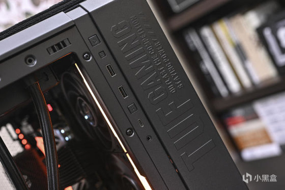 機箱的 I/O 接口位於前面板右上方,從上往下分別爲:開關機按鍵、重啓按鍵、USB3.2 Gen 1 Type-A 接口 x2、燈光控制切換按鍵、1 個 USB3.2 Gen2Type-C 接口x1 以及一個 3.5mm 音頻複合接口。在接口右側則是機箱的凸板鋼印文字,上面印有 TUF GAMING 等字樣。