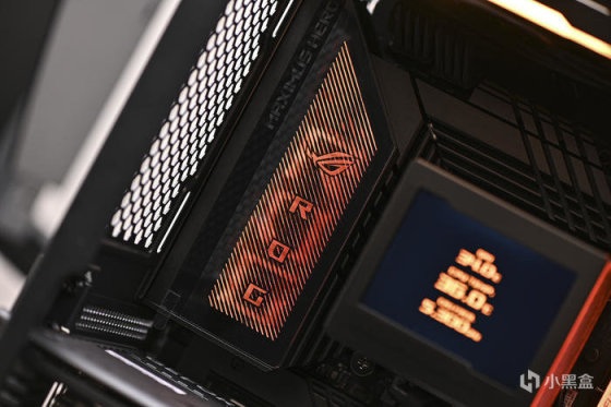 側面燈效及功率顯示屏展示。內置 OLED 顯示屏,開機時有載入動畫,可實時顯示負載瓦數、電壓等信息。右側 ROG 標識及斜紋爲 ARGB 設計,通過單獨的信號線接駁主板(5V RGB 接口)支持 ARGB 光效自定義及 AURA 神光同步調控。
