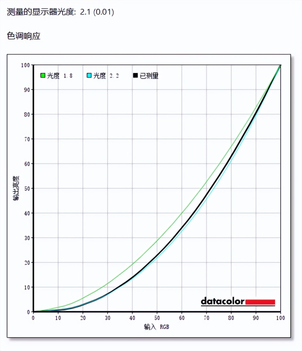默認模式下,色調響應實測光度2.1跟標準光度2.2偏差不大,電競顯示器一般光度調教都偏遊戲向,所以實測跟標準光度都有差異,測過幾款電競顯示器都有這個現象。