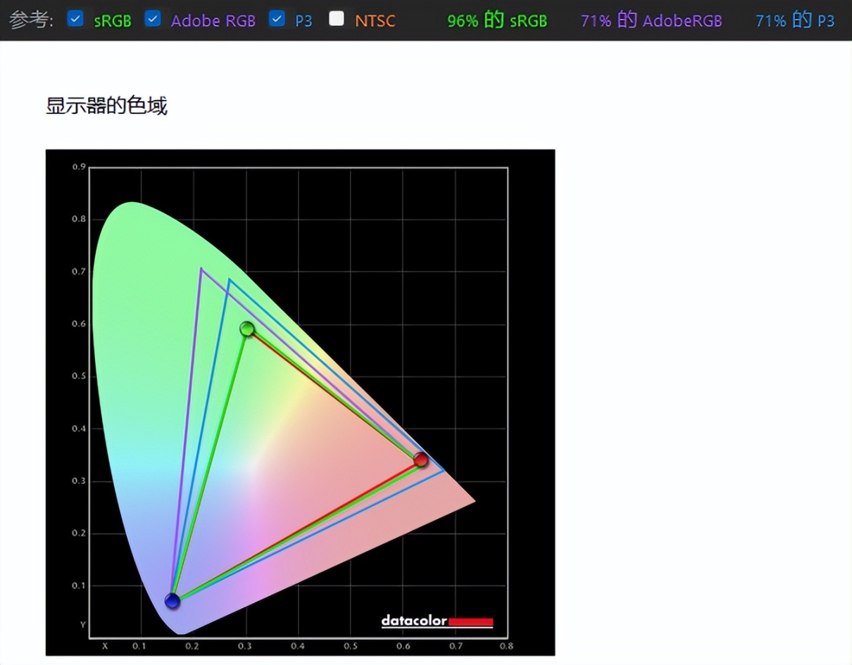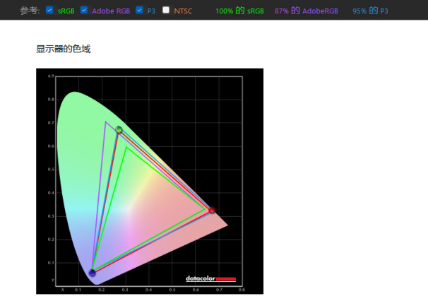 切換到sRGB模式下測得色域覆蓋爲95% sRGB+71% Adobe sRGB+70% DCI-P3,色域縮限處理的還算比較到位,對於不喜歡日常使用不喜歡廣色域的朋友,可以在sRGB模式下使用。