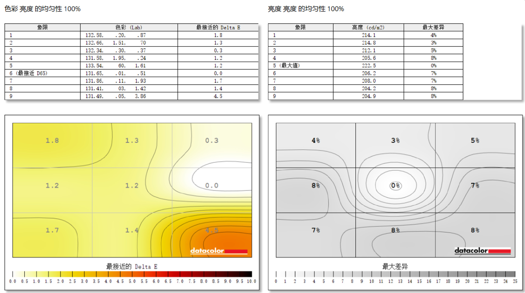 色度&亮度均勻性方面,兩者表現極佳,100% 亮度下:色彩均勻性最大差異4.5,亮度最大差異只有8%,這個亮度差異表現在LED顯示器中算是非常優秀的。