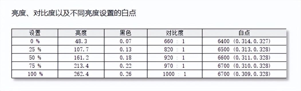 亮度與對比度測試測得這臺顯示器實際最大亮度爲262.4cd/㎡,最小亮度48.3cd/㎡,最大對比1000:1,白點在 6400~6700 之間,各項參數都跟標稱參數一致。