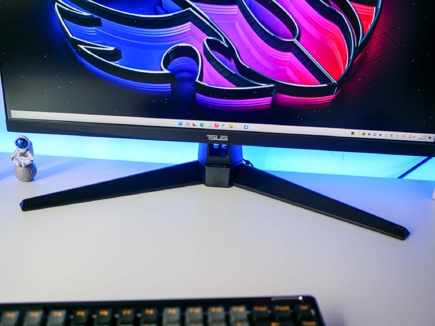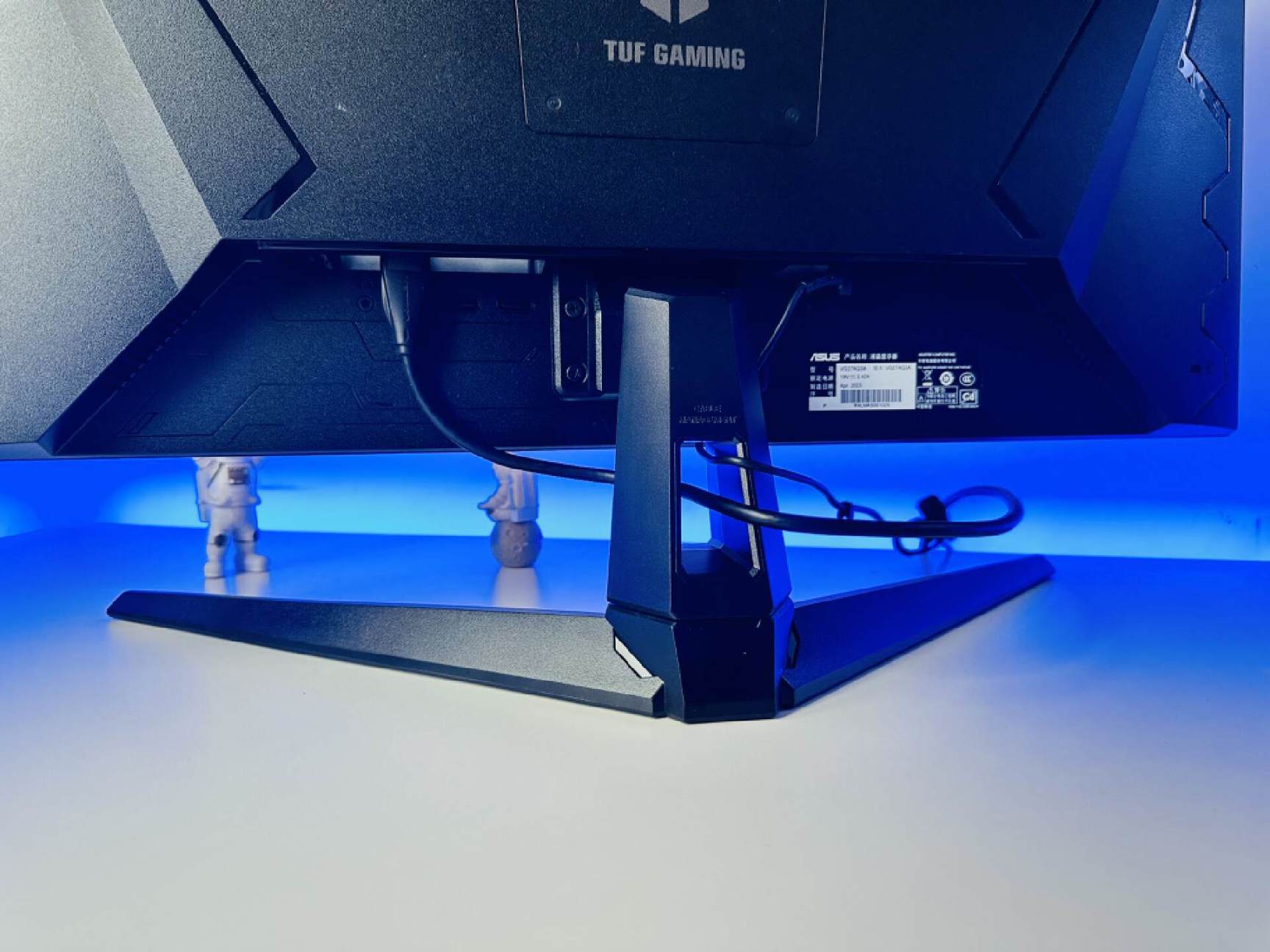 底座是電競顯示器常見的三角形支架,TUF小金剛PLUS的支架角度設計的比較大,底座佔用桌面面積並不是很大。