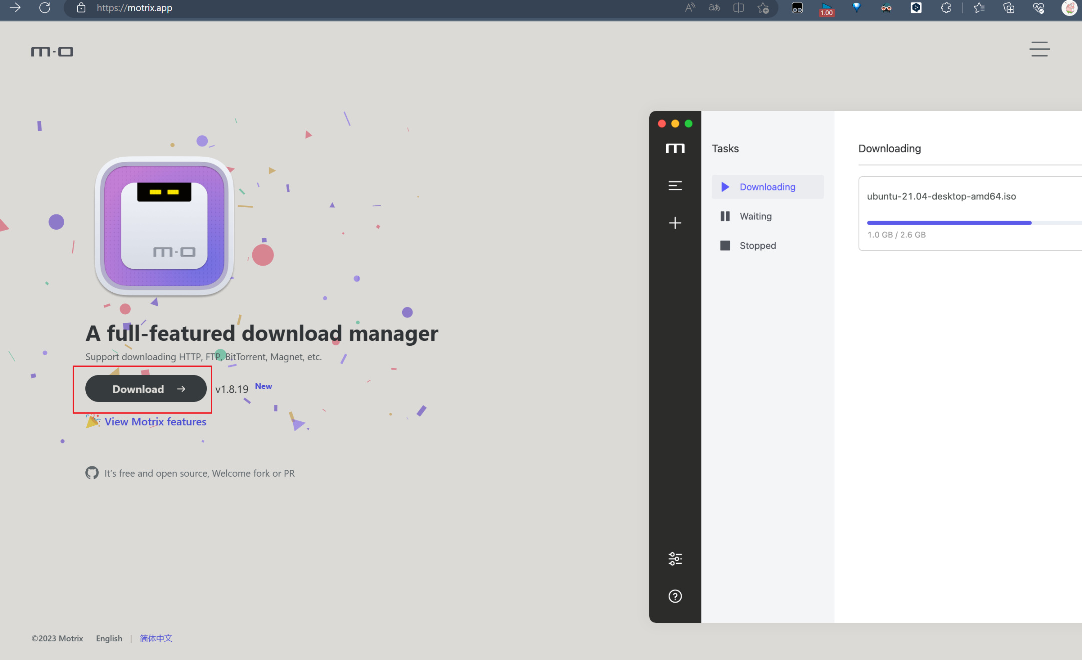 1.输入网址(https://motrix.app),进入该界面后,点击红色标记的“Download”(下载)按钮