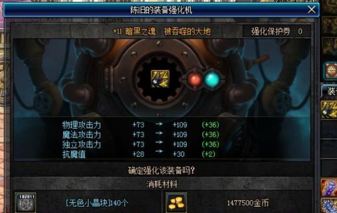 當然了,既然是強化怎麼可能百分之百成功,怎麼可能不會損毀?前五次百分之九十成功(實則機制可以暗改,比如前三次都必定成功,後兩次才百分之九十),六次之後百分之八十,每次強化兩元(繼續暗改,前兩次九十,之後八十),十次之後,百分之七十,每次五元(實則機制完全不是這樣的,前兩次百分之七十,之後就百分之四十了),強化到最高十五次裝備名字變成金色,全區播報。