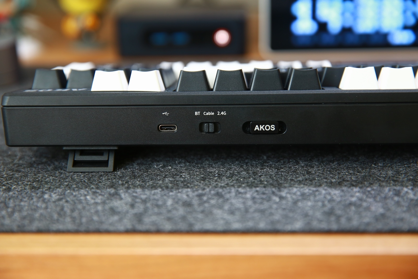 三模键盘的切换开关、充电口以及无线接收器都在键盘的后面,没有花哨的布局,一切都是规规矩矩的感觉。