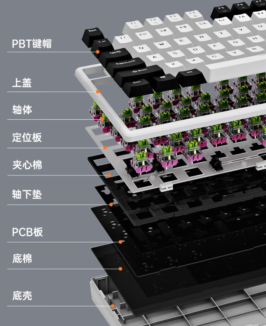 AKOS阿考斯BC98是GASKET结构,键盘上下盖之间多点垫片填充缓震,有效消除敲击时的结构性碰撞杂音,搭配PC材质的定位板,敲击软弹更舒适,每次敲击都是纯粹的享受